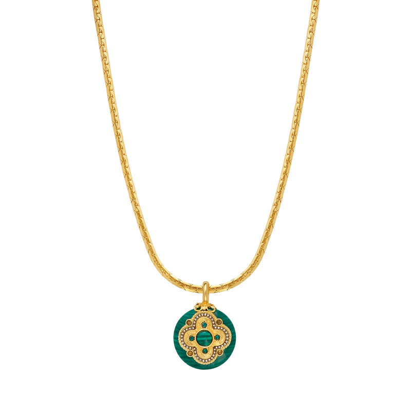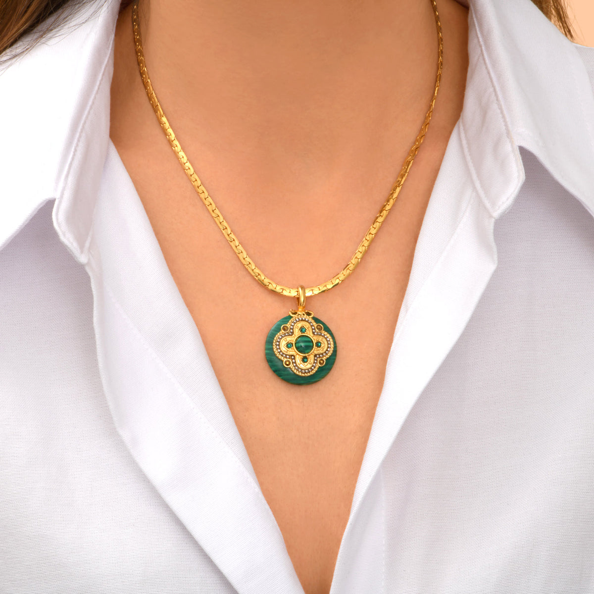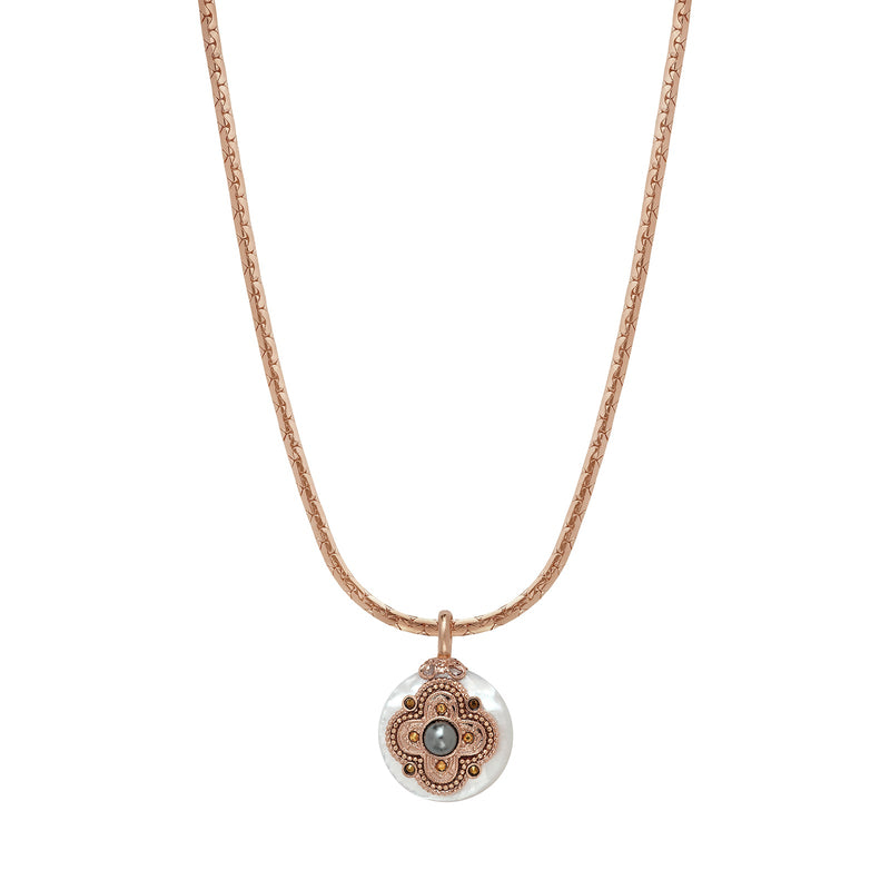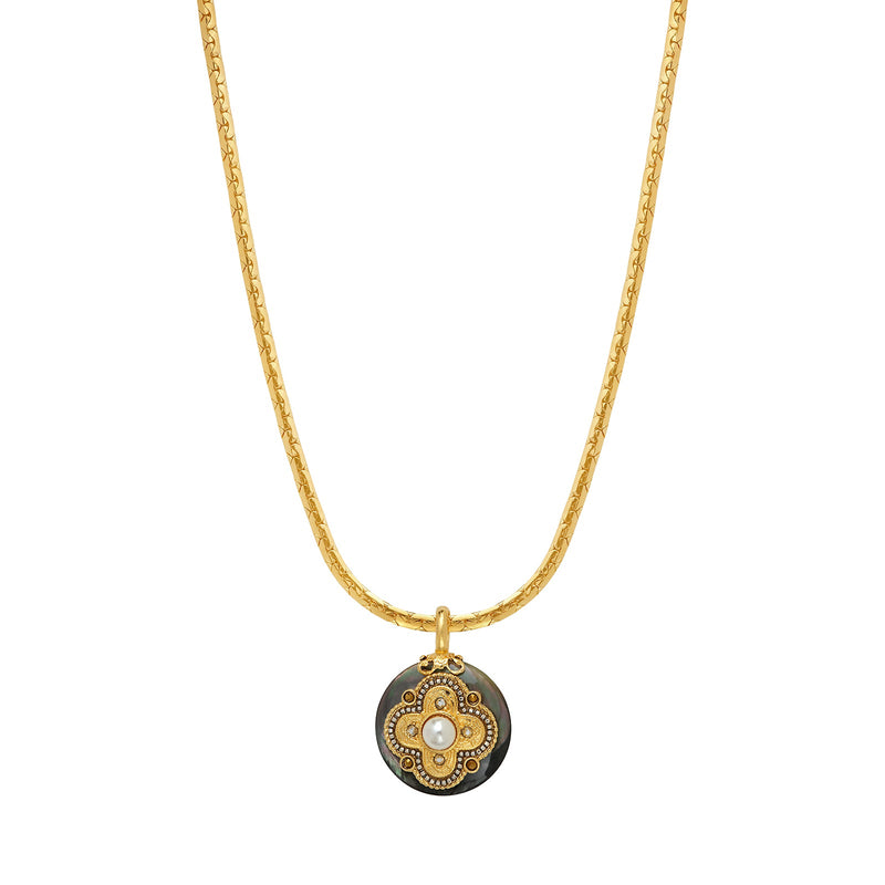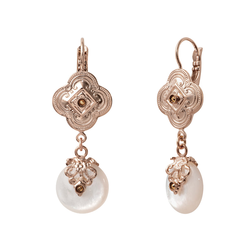 18-carat gold-plated pierced earrings set with a grey tinted mother-of-pearl medallion and crystals.