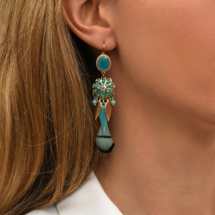 A true feat of delicacy and craftsmanship, our Alizia earrings highlight the couture spirit of our fashion jewelry collections. Combining dyed natural feathers, gold-plated metal, and enamel, along with Japanese beads and glass beads, these earrings are secured by an enamel cabochon and a sleeper clasp. The silk thread, embroidered directly into the jewelry, and the featherwork emphasize the artisanal skill of our maison and the refinement of this handmade gold-plated and turquoise enamel piece.