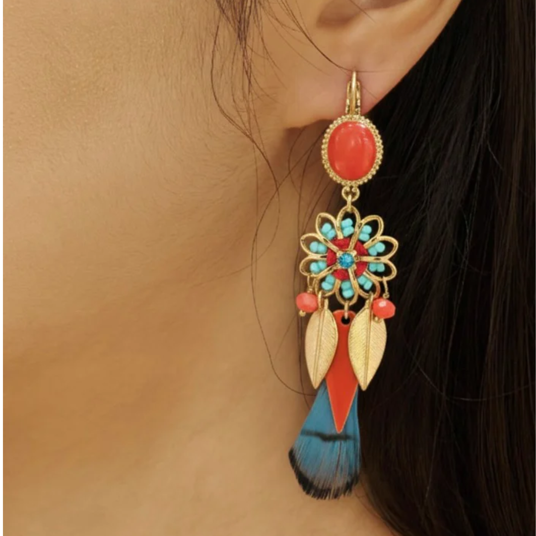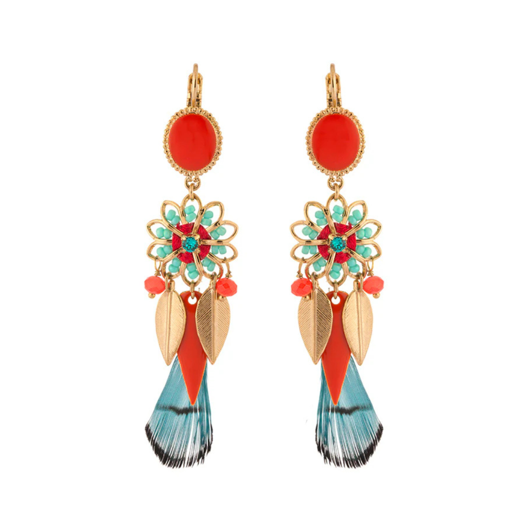 Our Alizia earrings in red and blue hues add a vibrant touch to any outfit. The gold-plated metal and red enamel create a striking contrast, while the dyed natural feathers, Japanese beads, and faceted glass beads add texture and lightness. The enamel cabochon and sleeper clasp highlight the modern elegance of this couture accessory, while the hand-embroidered silk thread reflects the artisanal craftsmanship of our Parisian maison. These lightweight earrings combine color and sophistication for a bold style!