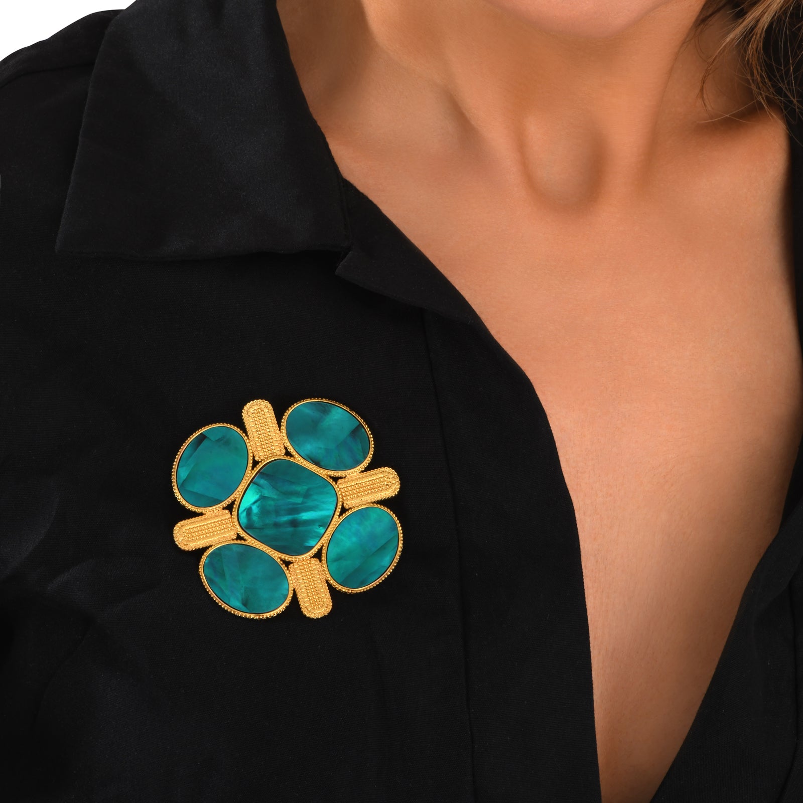 Ashanti Brooch In Metal & Mother-Of-Pearl – Green Turquoise