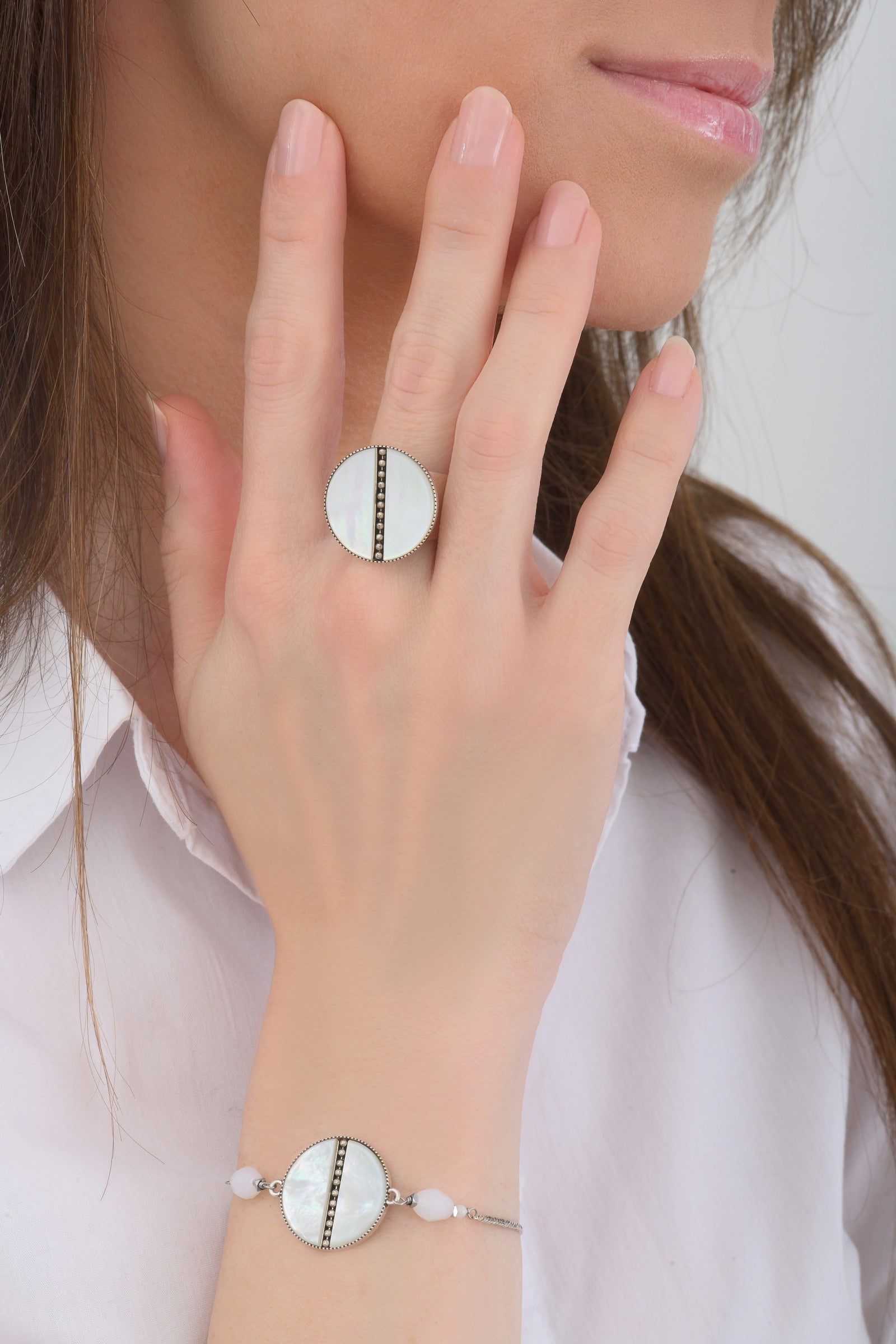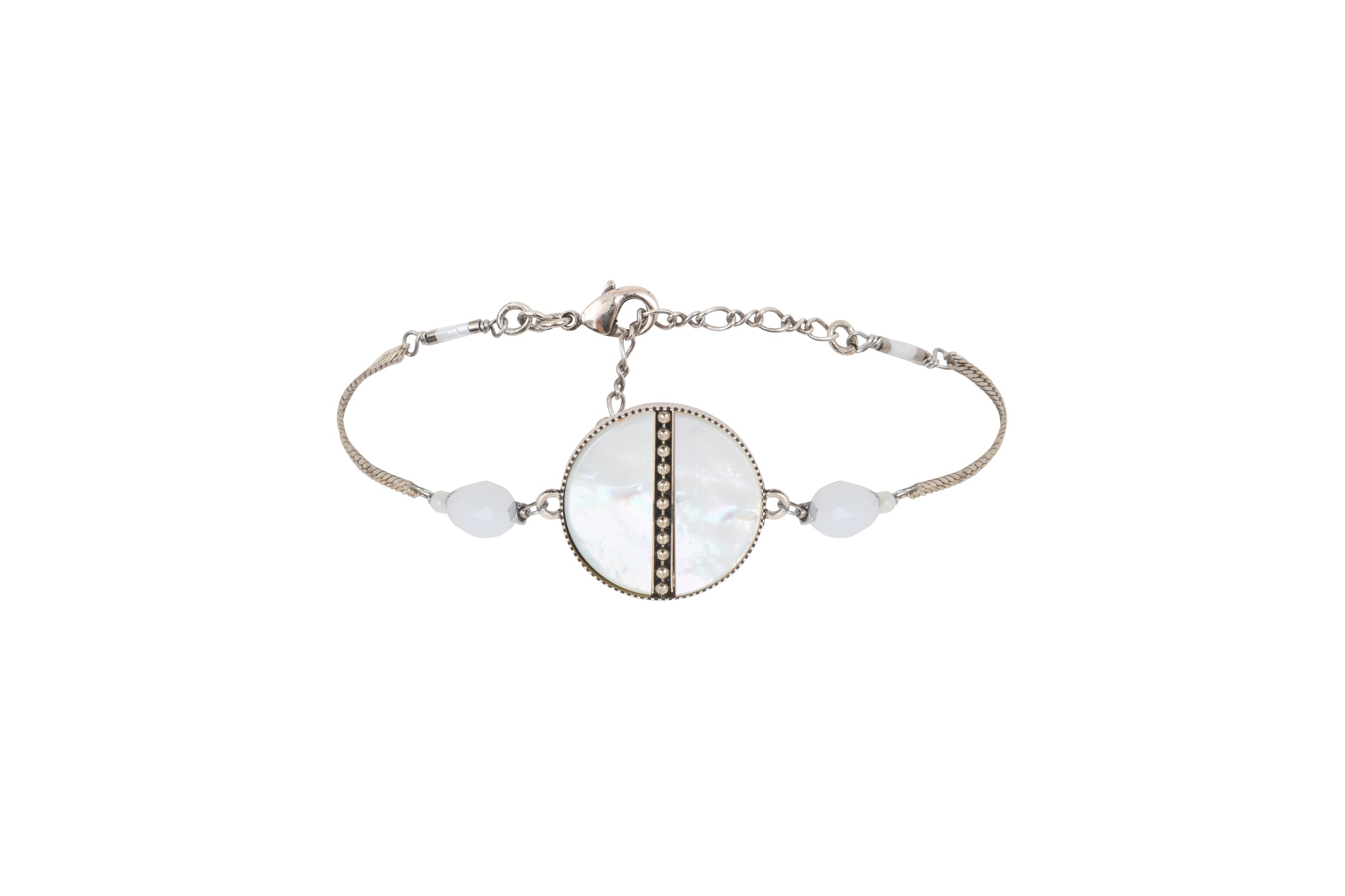 The white and translucent shades of this flexible bracelet highlight the femininity of this elegant jewellery. The white mother-of-pearl is delicately inlaid in the silver-plated metal in a style that is reminiscent of detailed marquetry. Faceted Japanese seed beads add delicate and radiance to this refined bracelet, which is perfect for any occasion.
