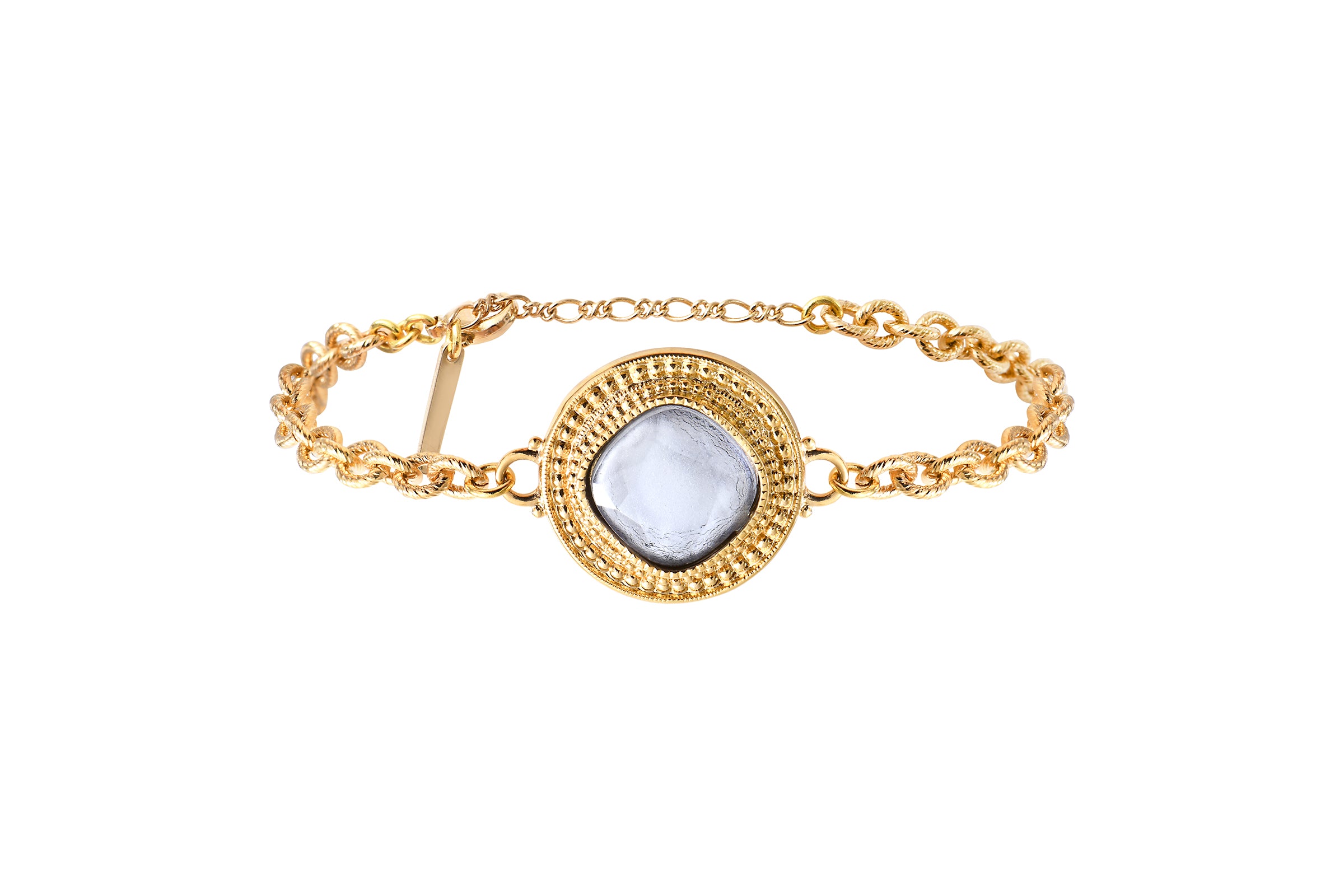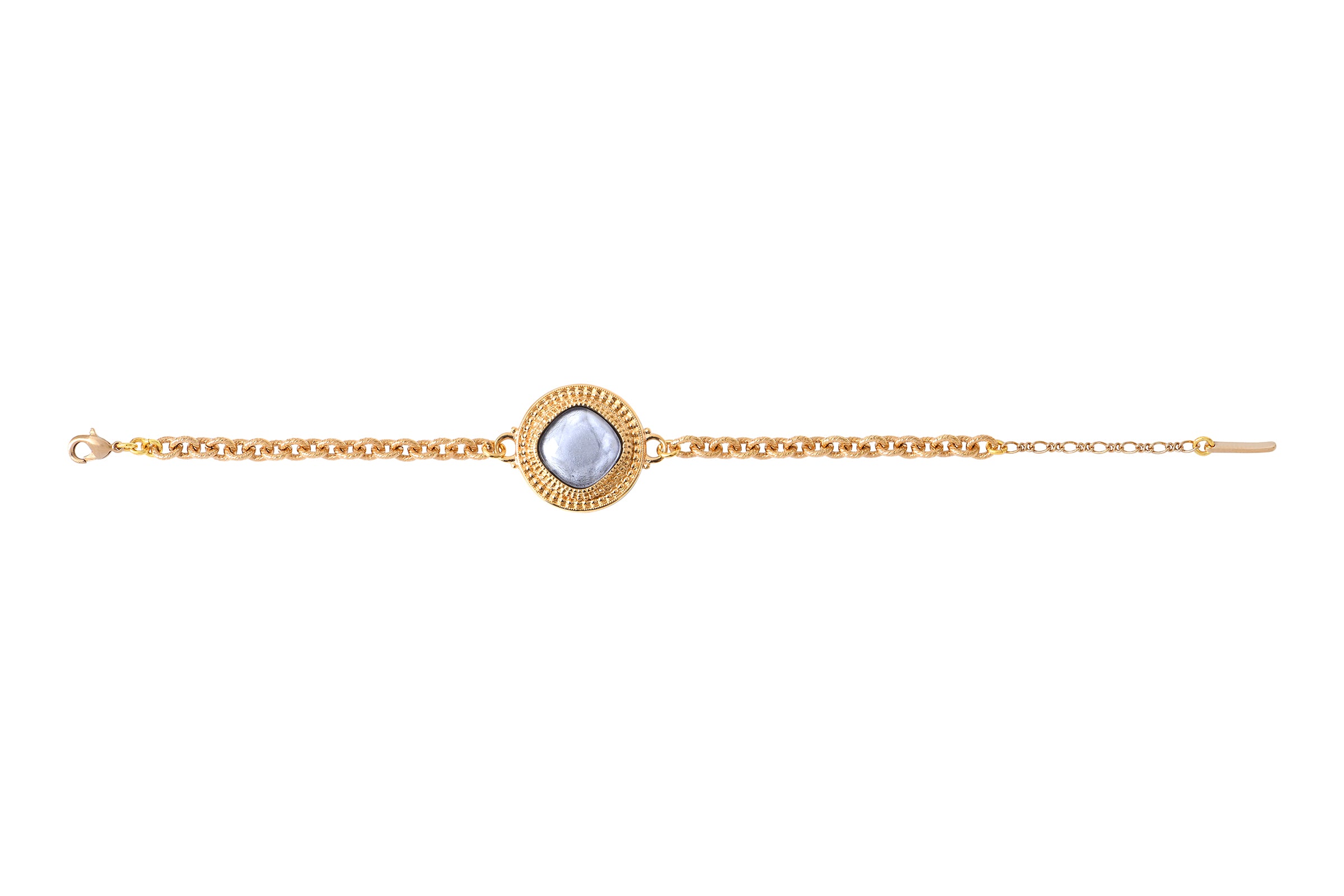 This chic and timeless feminine bracelet will adorn your wrist for any occasion. Mounted on a fine gold-plated metal jewel chain, a pearly white glass paste cabochon adds light to this creation from our Parisian studios. Its gold-plated metal mount is also embellished thanks to the skill and expertise of the Satellite artisans.