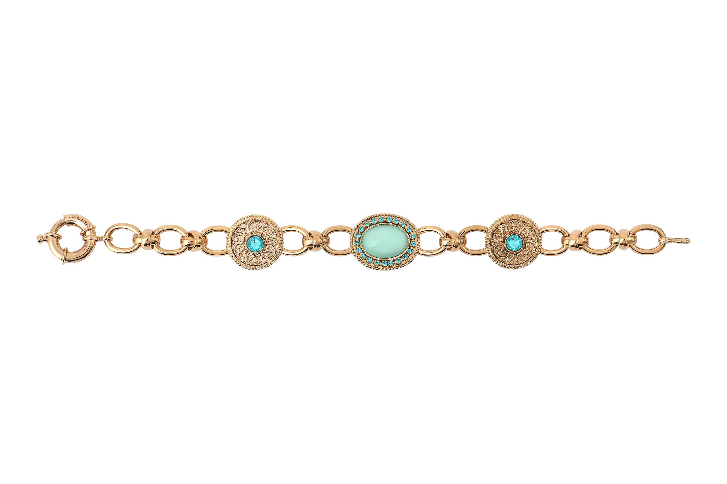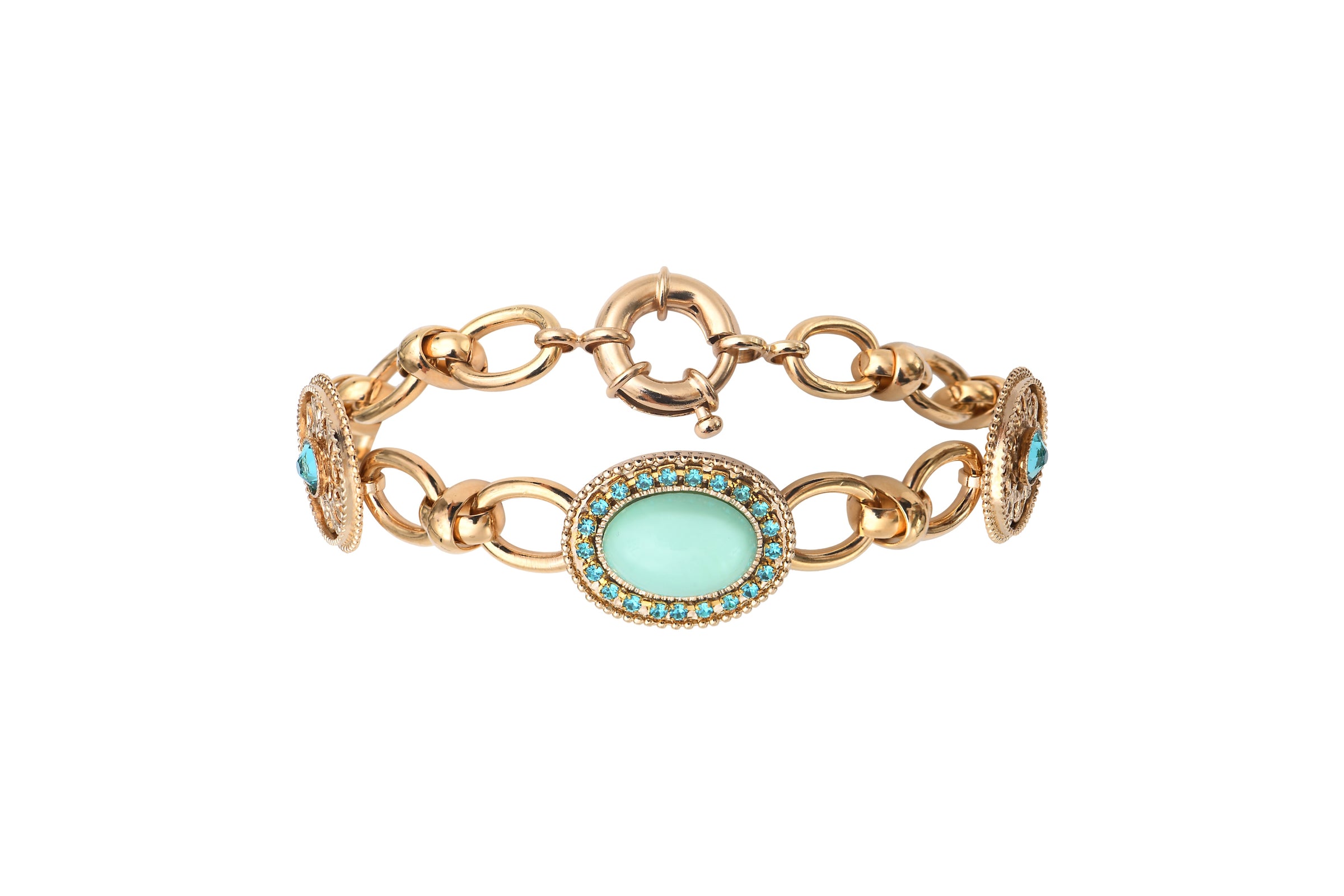 This elegant fine gold-plated metal chain bracelet stands out with its sophisticated chain links. Adorned with its light blue cabochon and azure prestige crystals, this timeless bracelet is one you’ll want to wear all the time. This Louise jewellery will be a real hit, either as a refined gift or a treat for oneself.
