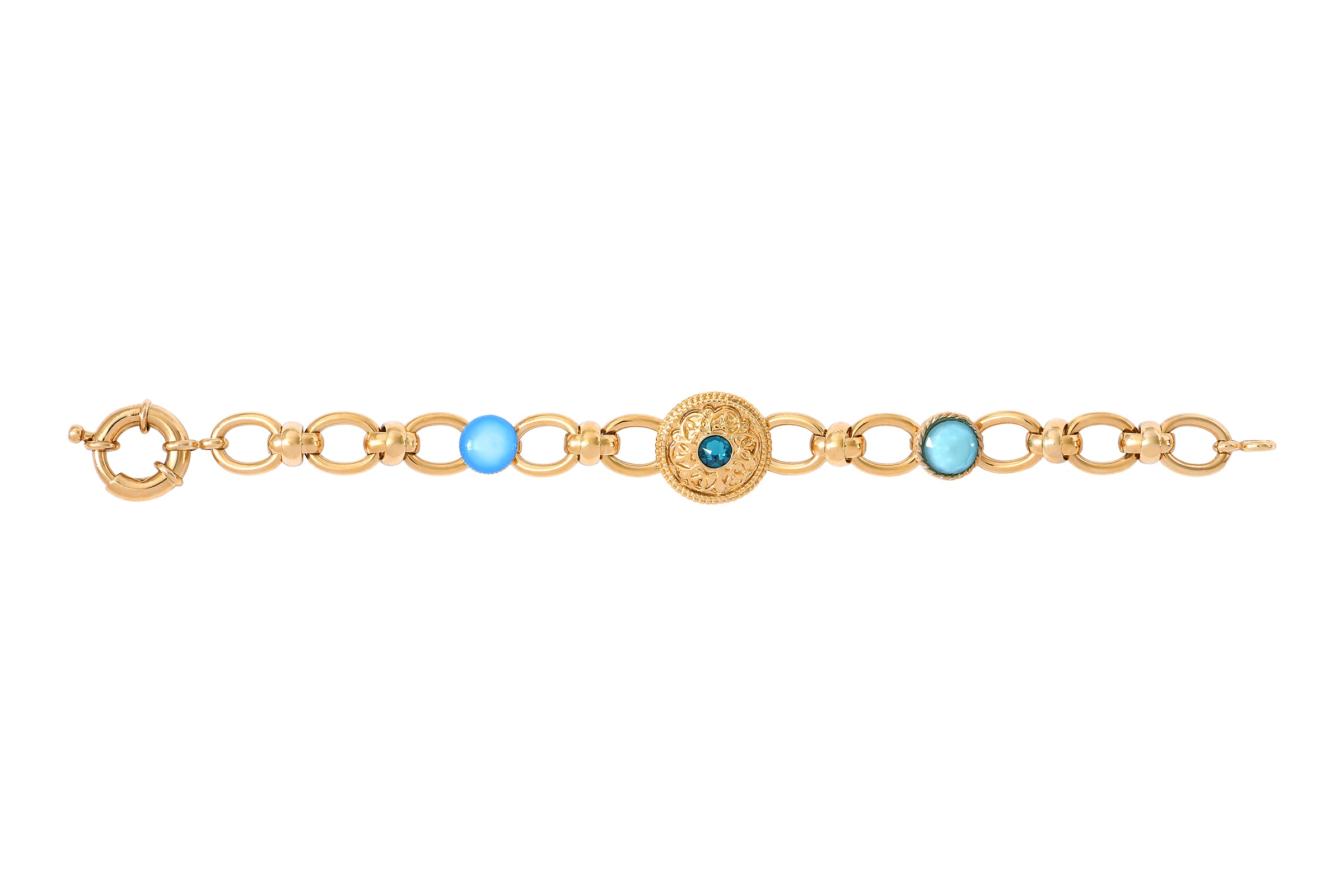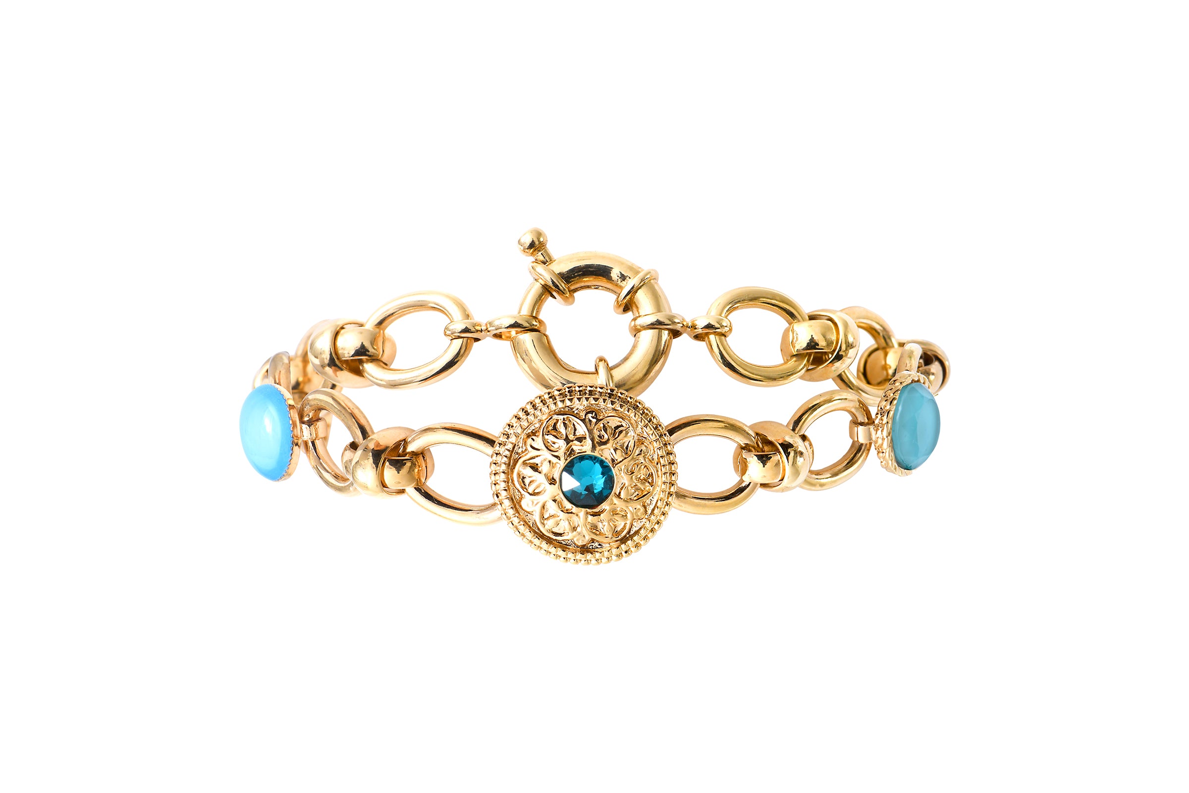 This season, the Satellite woman is adorned with Louise jewellery that resembles precious jewels. This fine gold-plated chain bracelet is no exception! Set with Prestige crystal and turquoise cabochons, this jewellery is richly embellished thanks to the skill and expertise of our company to reveal the queen you are.