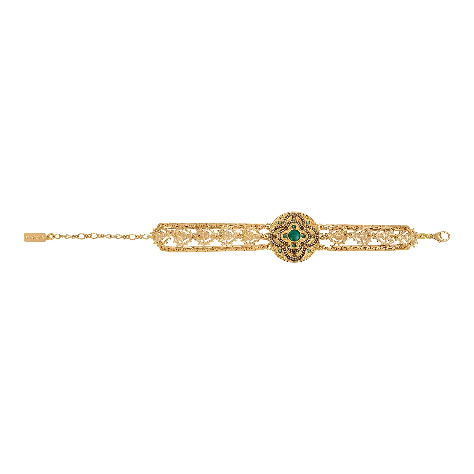 3-row adjustable 18 carat gold-plated chain bracelet set with crystals and a malachite-effect cabochon.