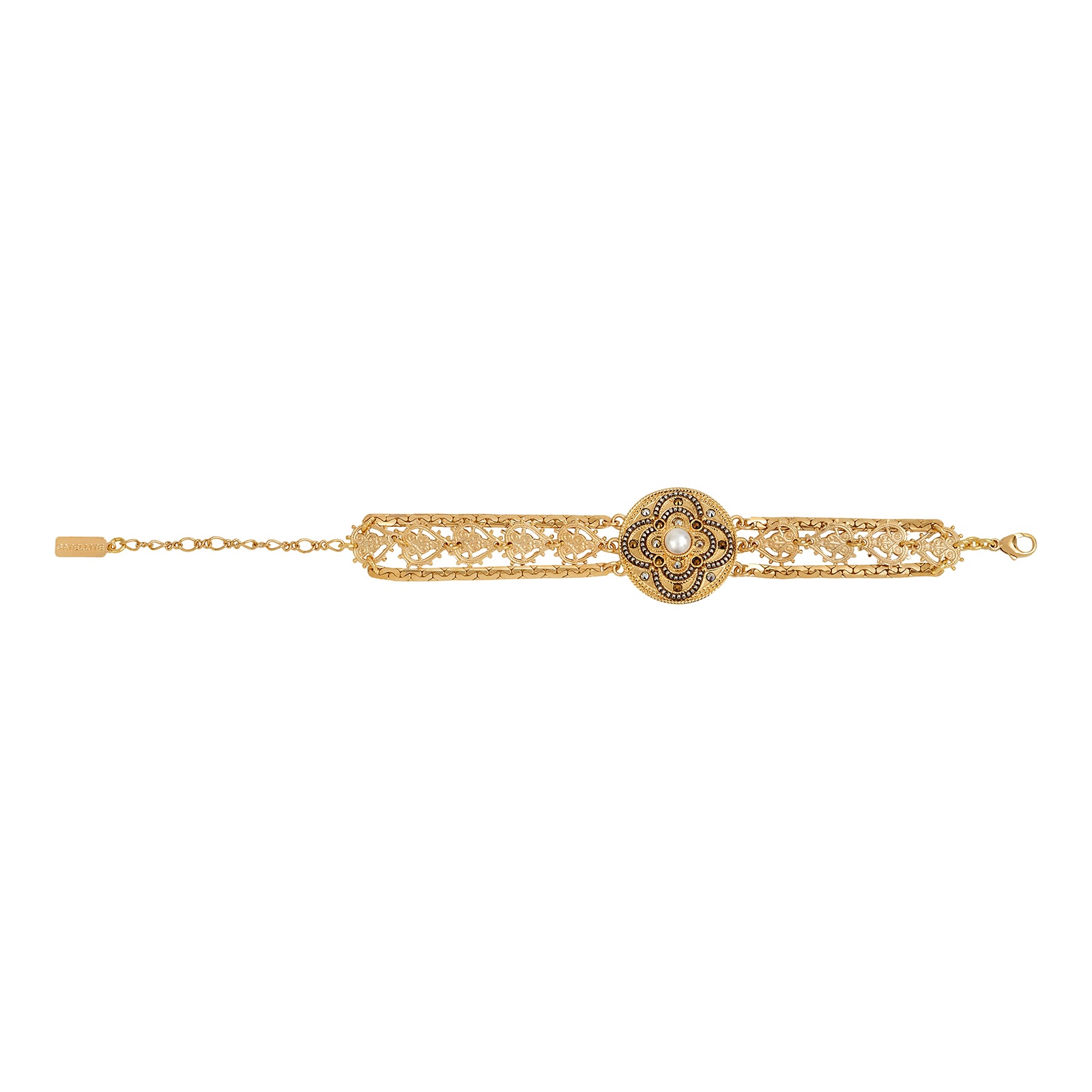 3-row adjustable 18-carat gold-plated metal chain bracelet set with crystals and a white mother-of-pearl cabochon.