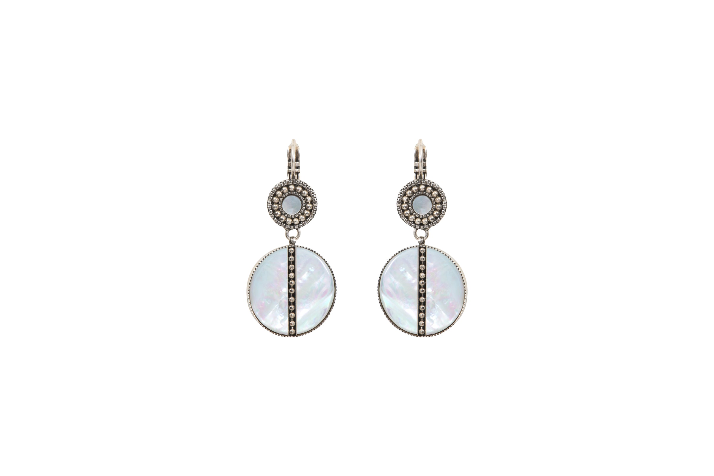 Composed of two silver-plated metal jewellery which have been carefully crafted thanks to the savoir-faire of our studios, these sleeper earrings are a timeless piece in our Hawaii collection. Inlaid with iridescent white mother-of-pearl, this precious jewellery with harmonious lines will enchant you with its radiance. An elegant white crystal adds further to this pair of earrings.
