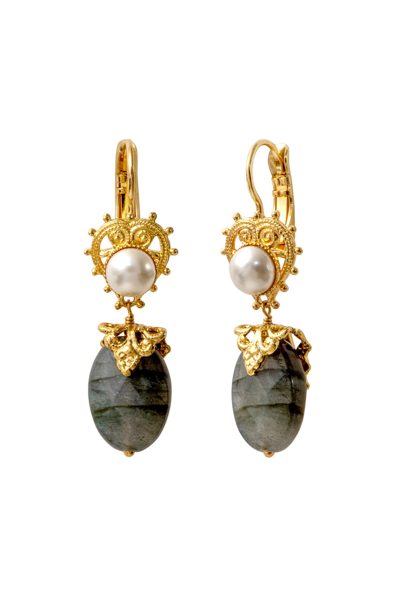 18-carat gold-plated pierced earrings set with a mother-of-pearl cabochons and labradorite.