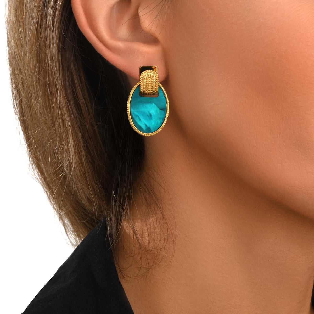Océane Stud Earrings In Gold-Tone Metal With Oval Composite Turquoise Cabochon – Turquoise