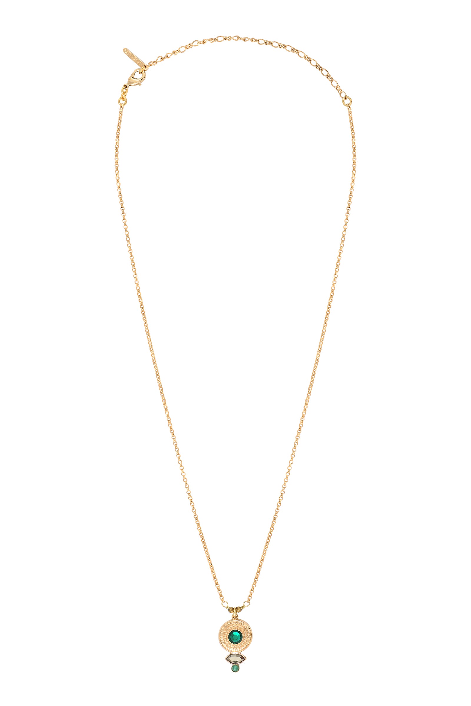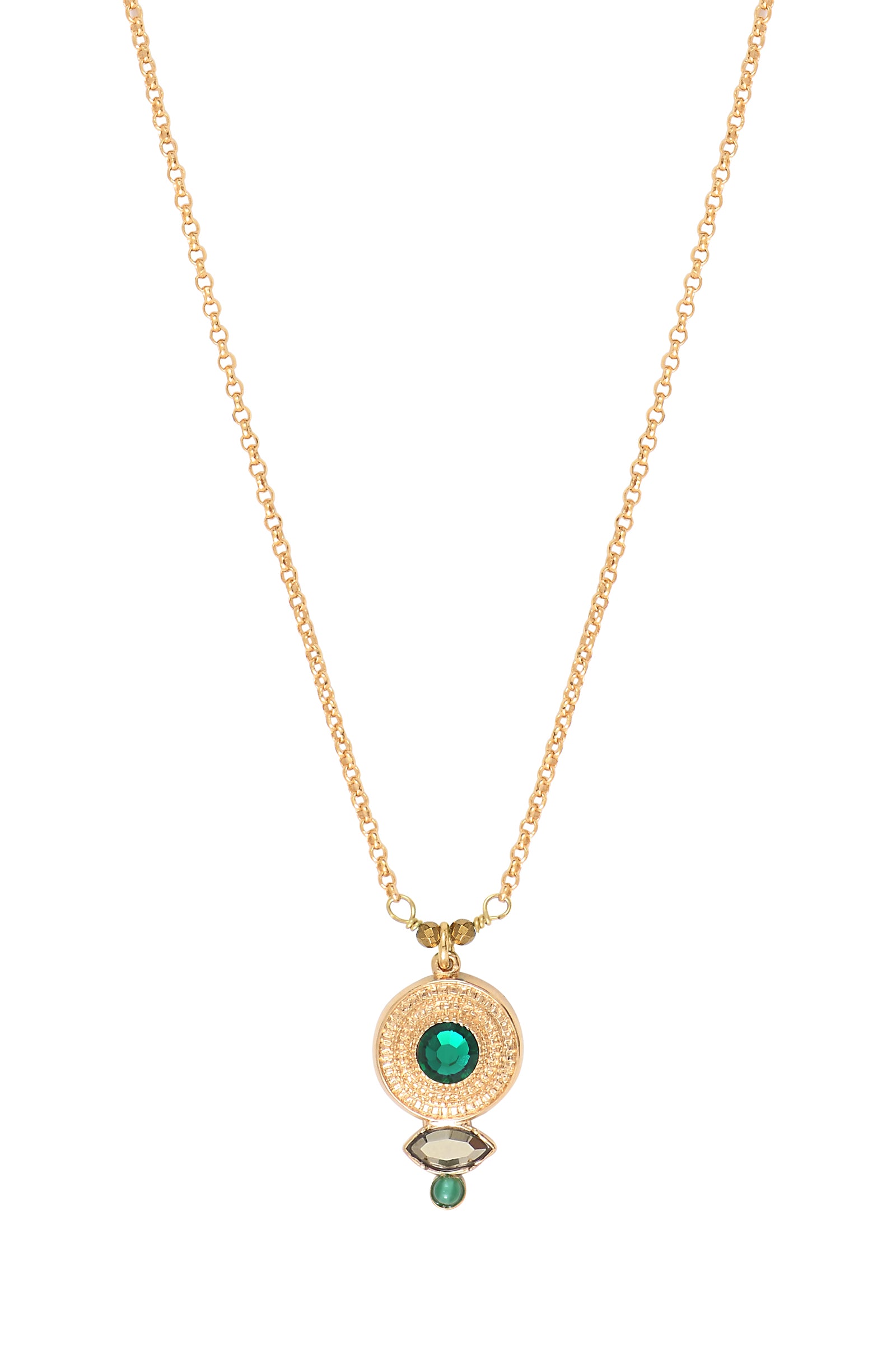 Worn alone or teamed up with other feminine Fujita necklaces, this pendant necklace will look great. Made in our studios from fine gold-plated metal, it features a finely worked pendant adorned with an emerald-coloured central crystal. Golden haematite beads, Prestige crystal and green agate add to the charm of this chic and modern necklace.