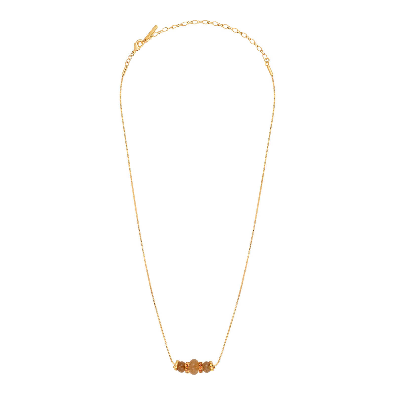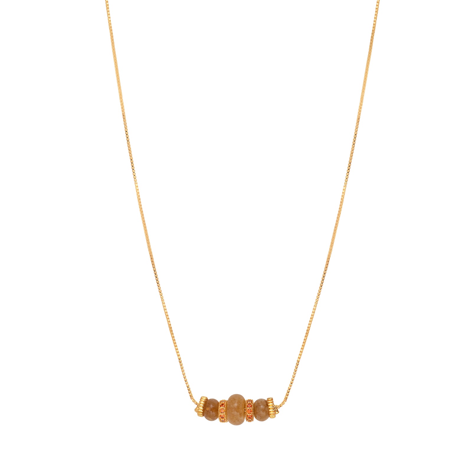 Fine adjustable pendant necklace in 18-carat gold-plated metal. Orange-tinted quartz beads, matching zirconium and gold-plated beads.