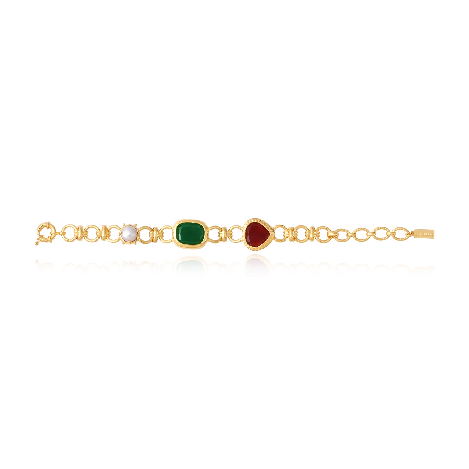 The Bysance bracelet features a rich, elegant composition combining an 18-carat gold-plated round-link chain with several decorative elements. At the centre, a green rectangular glass paste cabochon delicately framed in gold-tone metal captures the light and structures the jewel. It is paired with a red pear-shaped glass paste cabochon, enhanced by a worked metal frame, as well as a lustrous freshwater pearl that brings softness and balance. The combination of shapes, colours and materials creates an expressive, refined bracelet that is easy to wear every day. True to the spirit of the Bysance collection, this creation highlights light, richness of detail and Maison Satellite’s artisanal savoir-faire.