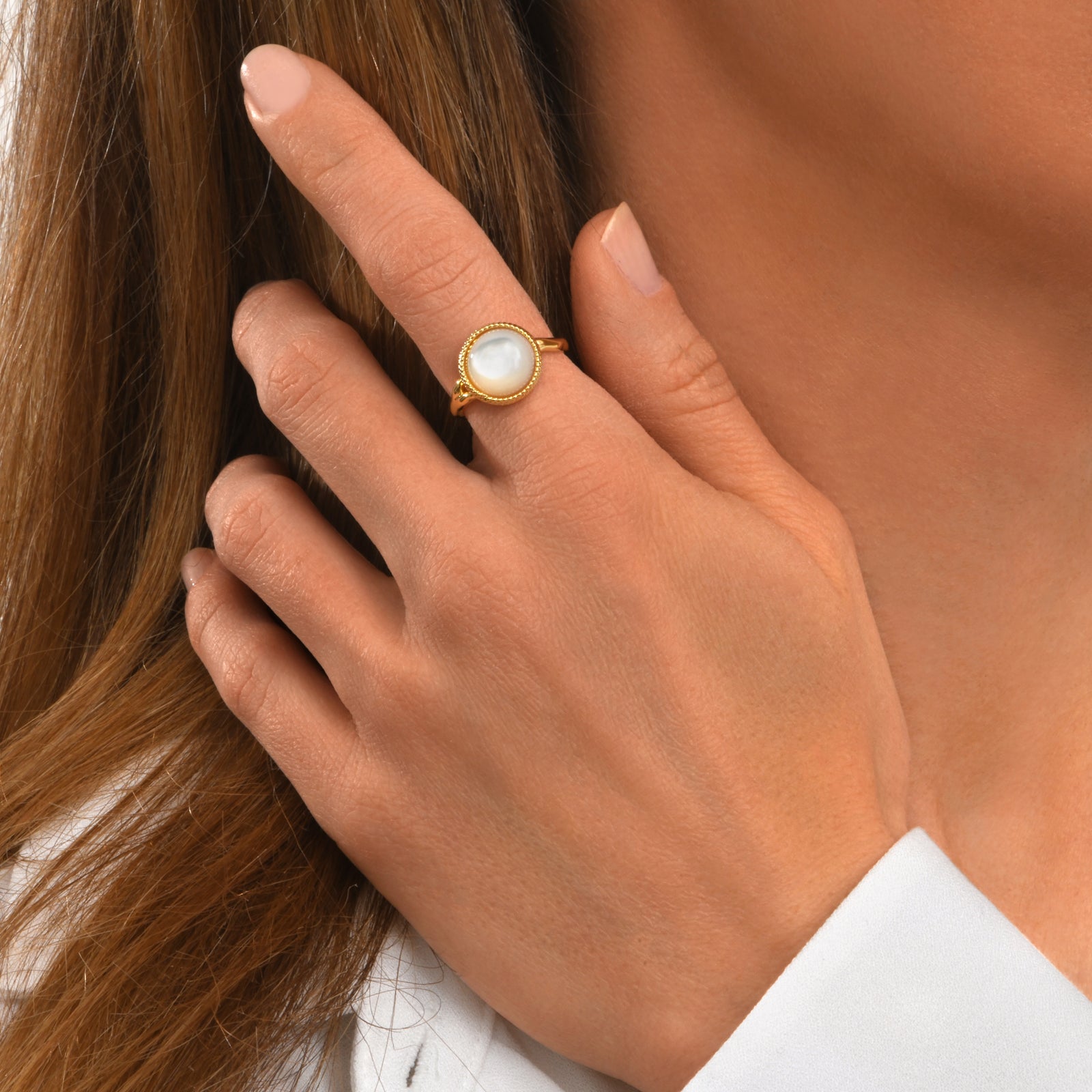 Océane Gold-Tone Metal Ring Size M, Round Mother-Of-Pearl Cabochon – White