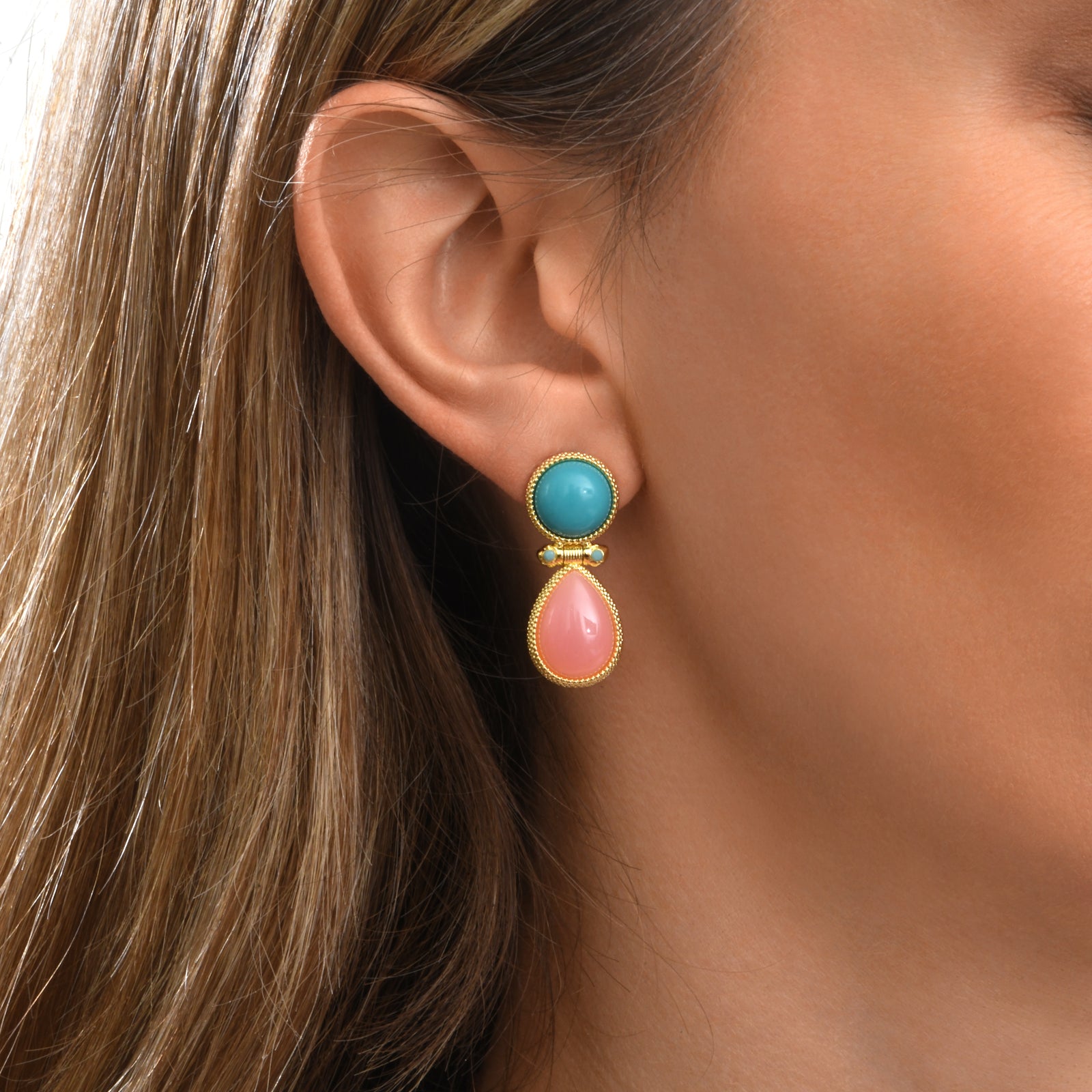 Océane pierced stud earrings adopt a fresh, summery multicolored palette. A round composite turquoise cabochon brings sparkle and character, paired with a rosy glass-paste drop that softly brightens the silhouette. Delicately framed with gold-tone metal, the two elements create an elegant harmony between color and transparency. The stud format guarantees a discreet, comfortable wear, perfect for everyday use. Inspired by marine reflections and summer energy, this creation embodies the joyful, sun-kissed spirit of the Océane collection, true to the Maison Satellite’s artisanal craftsmanship.