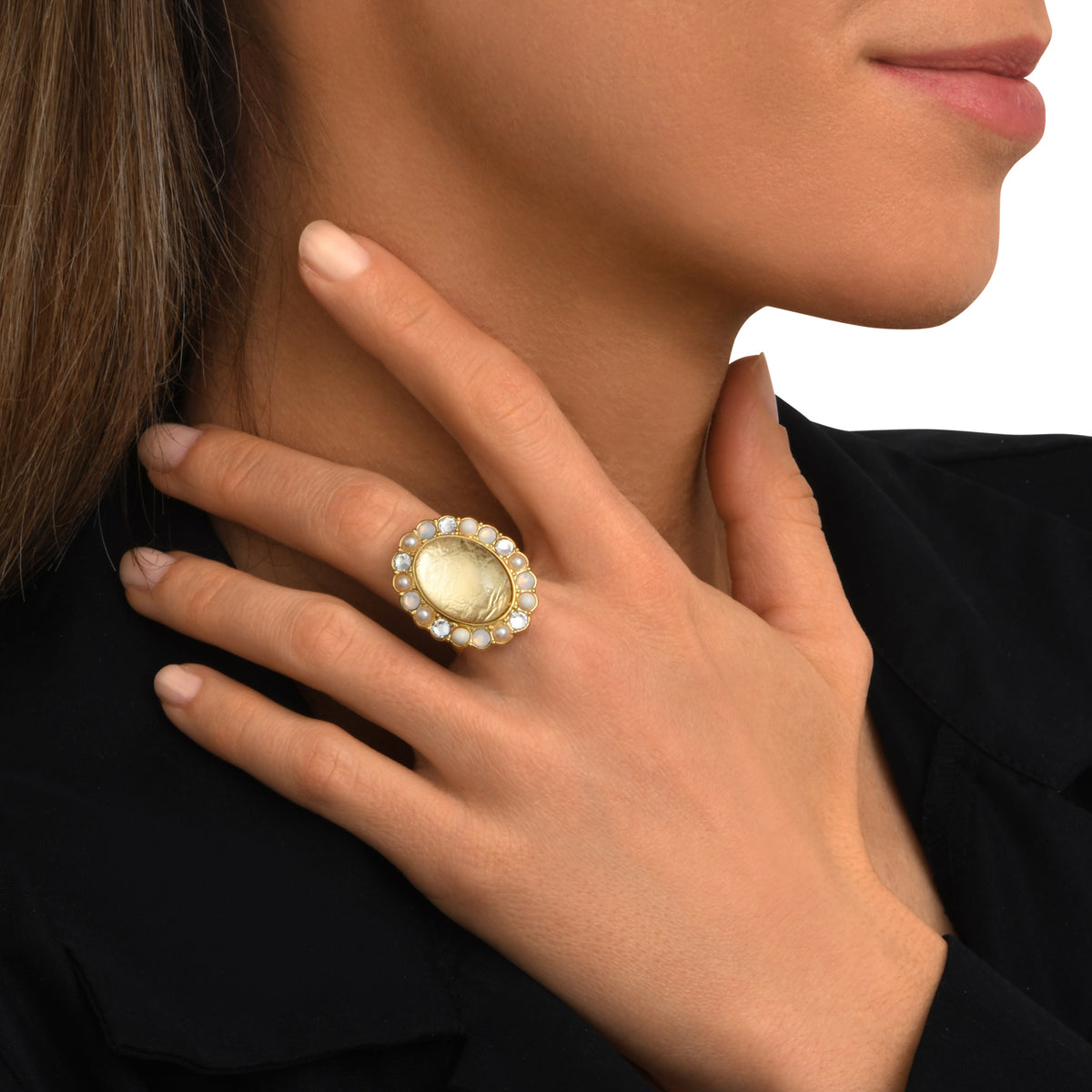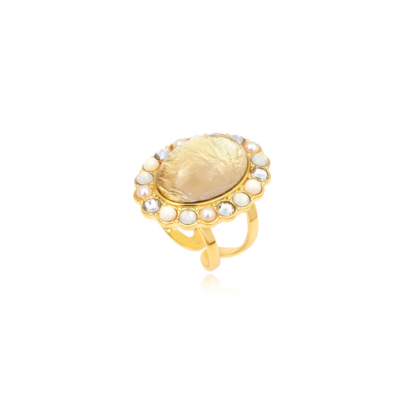 Océane Adjustable Gold-Tone Ring Size M, White Cabochon & Rhinestones – White