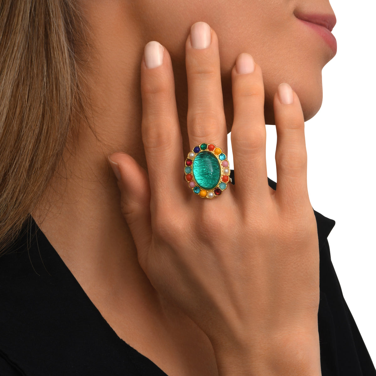 Océane Adjustable Gold-Tone Ring Size S, Colored Cabochon & Rhinestones – Multicolored