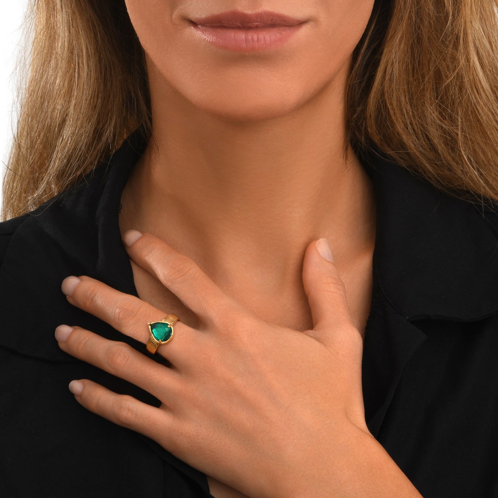 The Bysance ring features a blue glass paste cabochon cut into a teardrop shape, delicately set at the centre of a fine worked gold-tone metal band. Adjustable, it naturally adapts to all finger sizes and offers comfortable everyday wear. The depth of the blue shade catches the light and adds an elegant touch of colour, while the slender band perfectly balances the composition. This creation combines visual lightness and refinement in a contemporary yet precious spirit. True to the Bysance universe, this ring celebrates richness of materials and Maison Satellite’s artisanal savoir-faire.