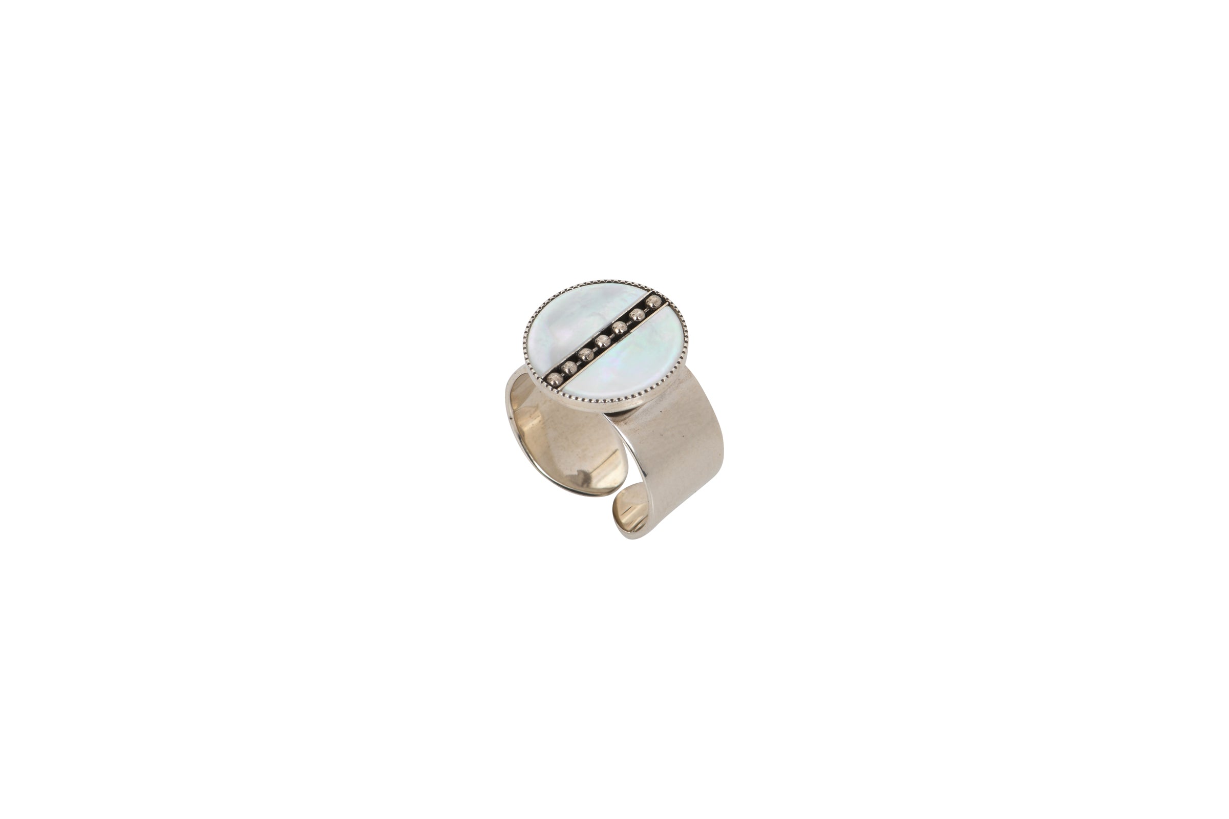 Timeless and perfect for adding cachet to an outfit that needs dressing up, this superb adjustable ring will definitely seduce you. Like precious marquetry, this silver-plated metal and white mother-of-pearl vibrate in unison, creating enchanting feminine appeal.
