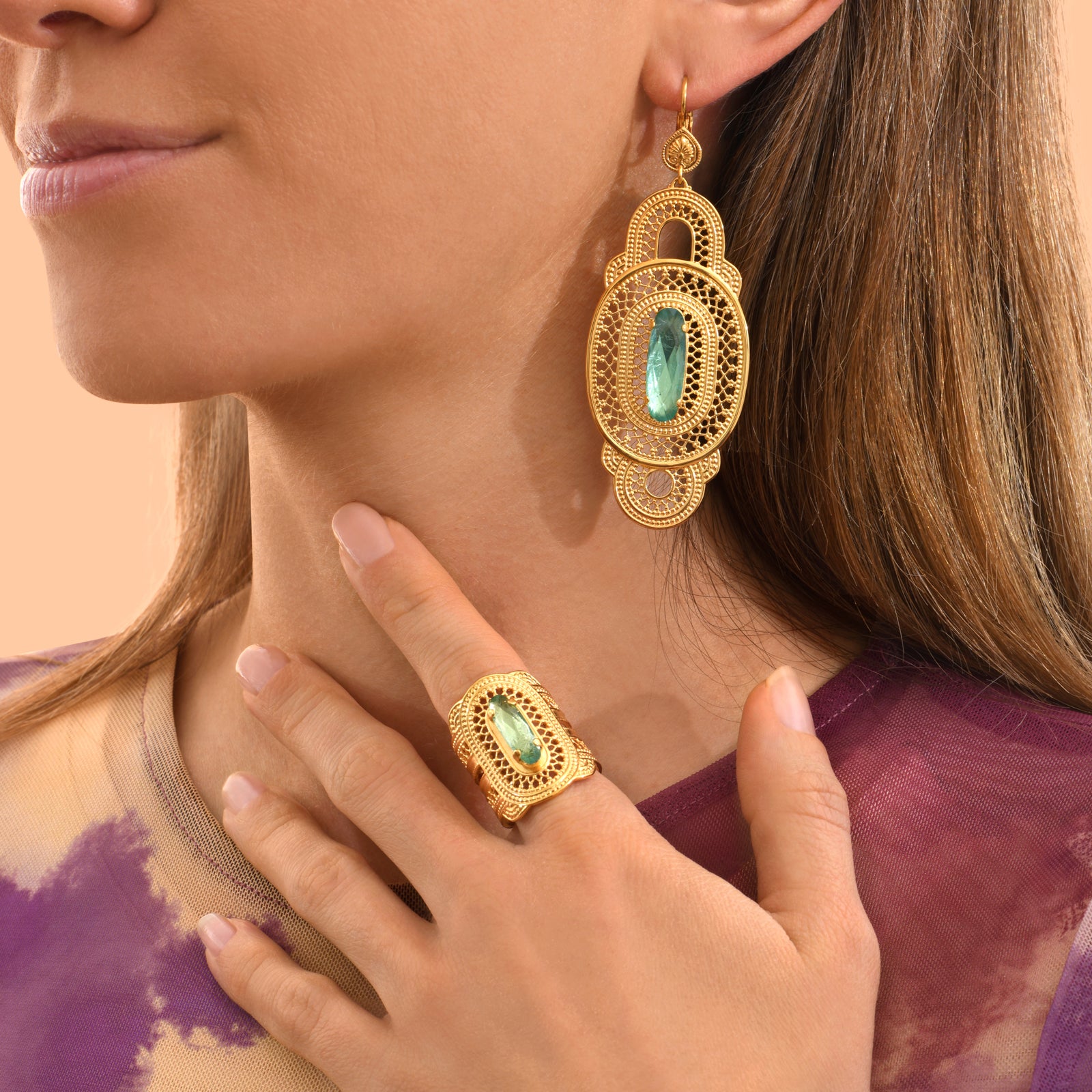 The azure sparkle of the Prestige crystal is perfected by the use of a thin sheet of copper applied to the back of the turquoise crystal. Set in 18-carat gold-plated metal filigree for a play of transparency and lightness, this touch of colour highlights the sunny spirit of these Noor sleeper earrings.