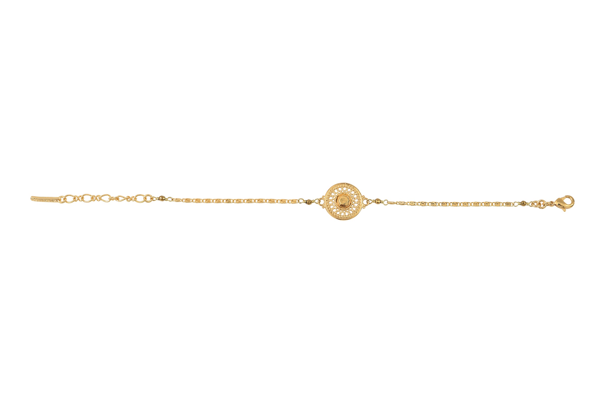 Delicacy and elegance perfectly describe this feminine 18-carat gold-plated metal bracelet. This timeless gold chain bracelet is adorned with a central openwork medallion set with a faceted gold cabochon. For added refinement, this bracelet, which delicately reveals the skin, is adorned with golden haematite beads.