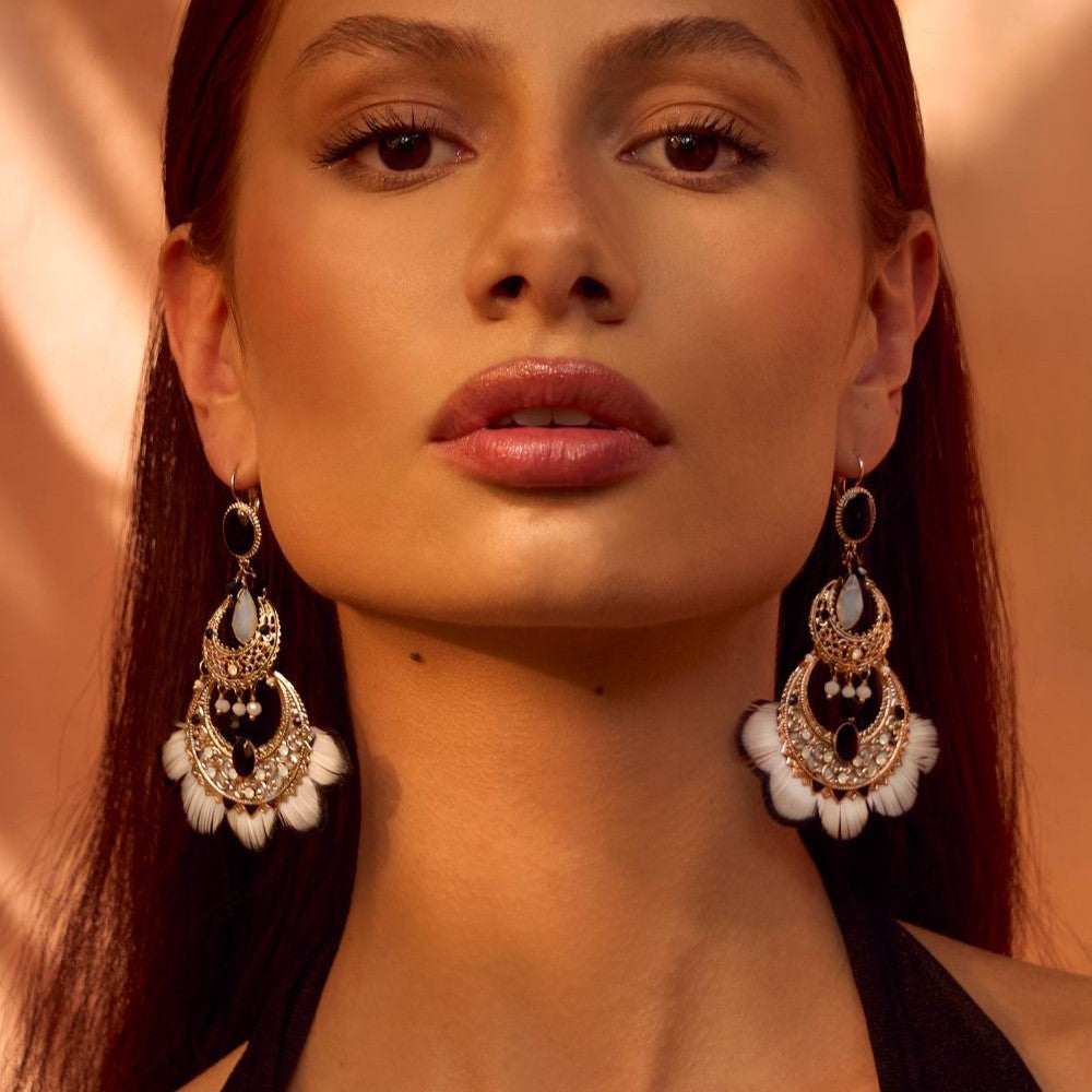 Combining the excellence of Satellite Paris craftsmanship and a touch of boldness, the Alizia earrings embody the couture inspirations of our Parisian maison. The gold-plated metal, intricately worked like lace, and the half-moon shape, perfectly complement the black-and-white dyed natural feathers, creating a light and airy piece. Crystals, faceted glass beads, and black enamel cabochons add brilliance and elegance, elevating this piece with a bold style. Perfect for a special event or elegant evening, these dangling earrings will become a must-have in your jewelry collection.