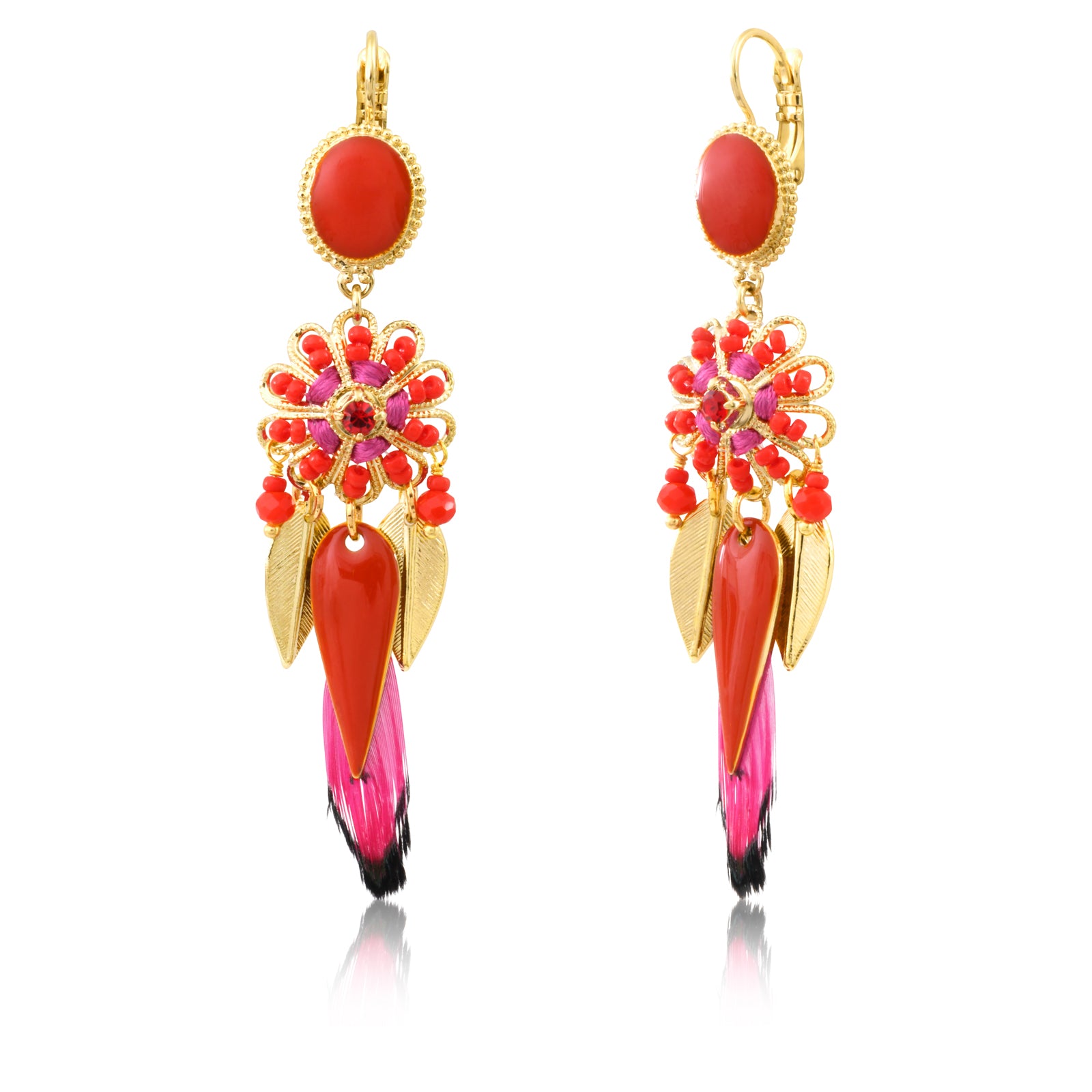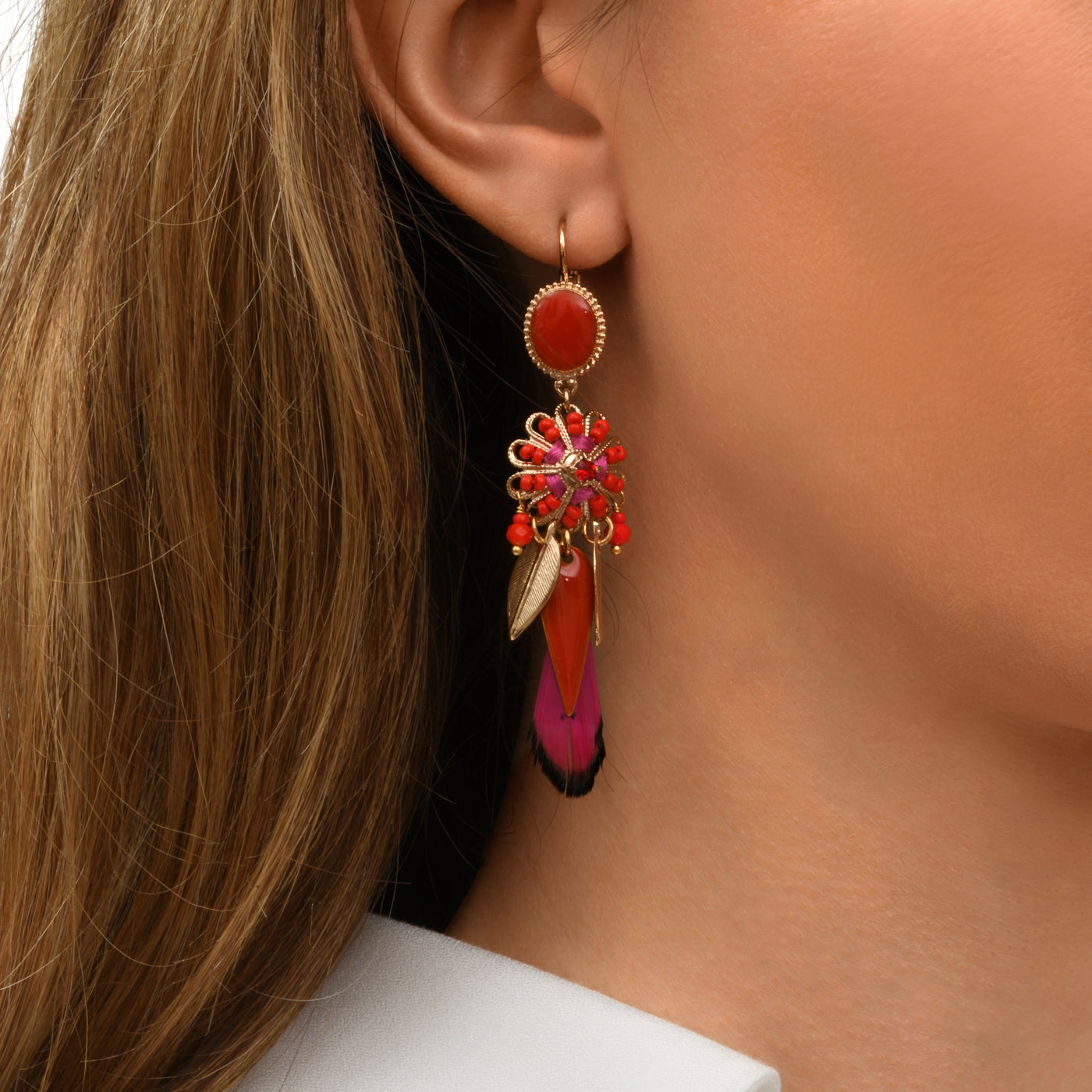 Our Alizia earrings in red and fuchsia hues add a vibrant touch to any outfit. The gold-plated metal and red enamel create a striking contrast, while the dyed natural feathers, Japanese beads, and faceted glass beads add texture and lightness. The enamel cabochon and sleeper clasp highlight the modern elegance of this couture accessory, while the hand-embroidered silk thread reflects the artisanal craftsmanship of our Parisian maison. These lightweight earrings combine color and sophistication for a bold style!