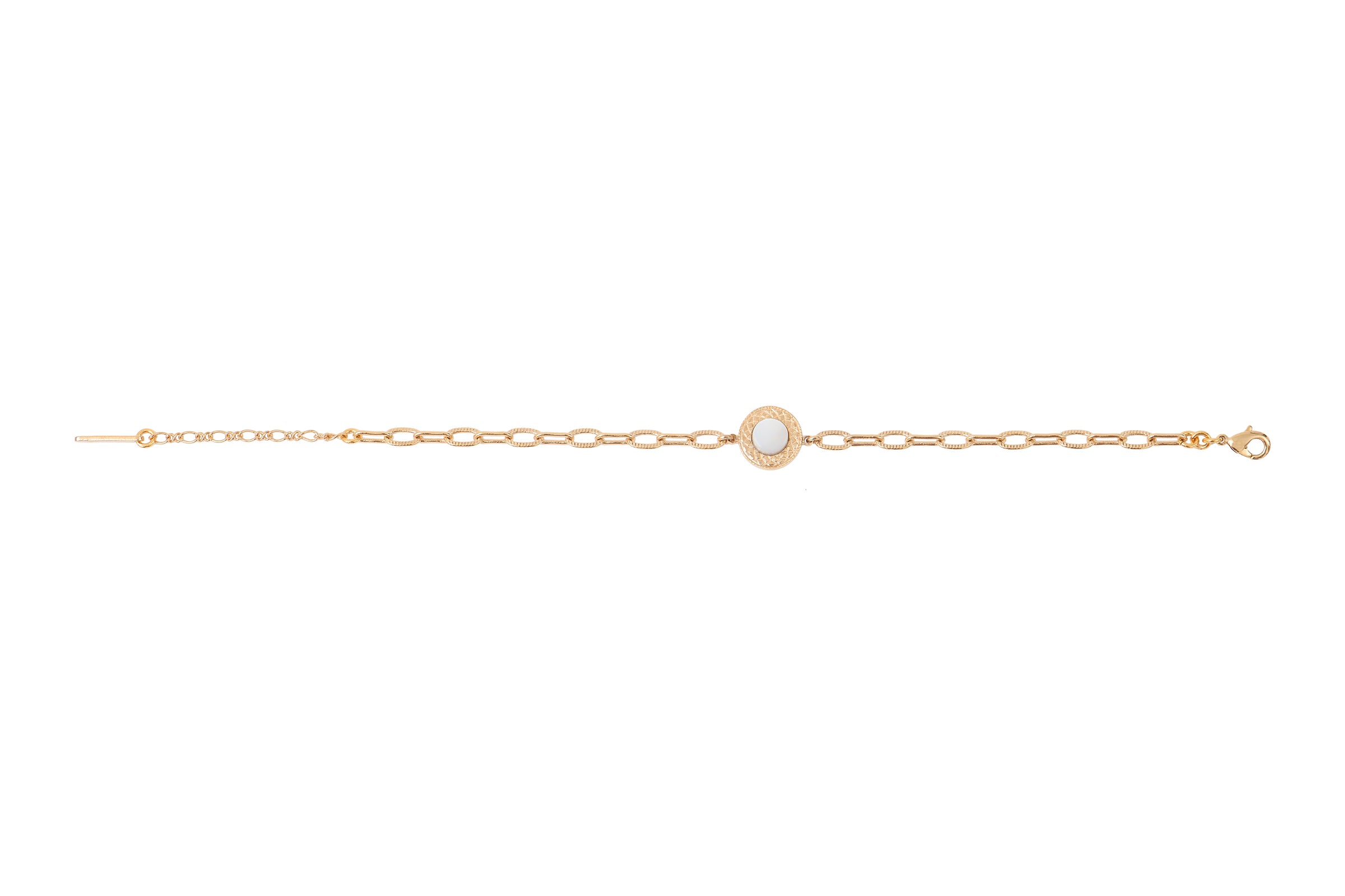 Worn alone or with the matching sleeper earrings and pendant necklace, this feminine bracelet is the promise of elegance. This feminine fine gold-plated metal jewellery is delicately hammered to better showcase the white mother-of-pearl cabochon. Its finely-worked links mean that you can wear this delicate, slim bracelet whatever the occasion.