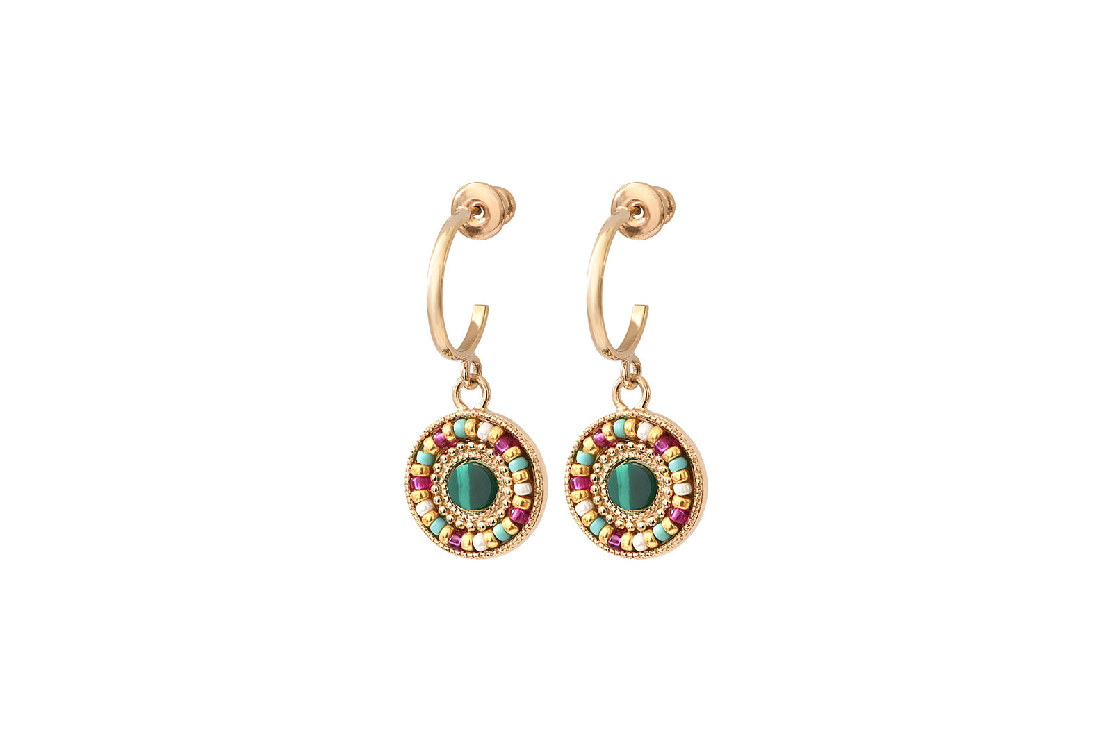 Adorned with our Claudia jewellery, you are sure to create a stir at any event or party. For a discreet touch of colour, these stud earrings are adorned with a reconstituted malachite cabochon and multicoloured Japanese seed beads. Wear a cabochon ring or a matching bracelet to create an original and sophisticated ensemble.